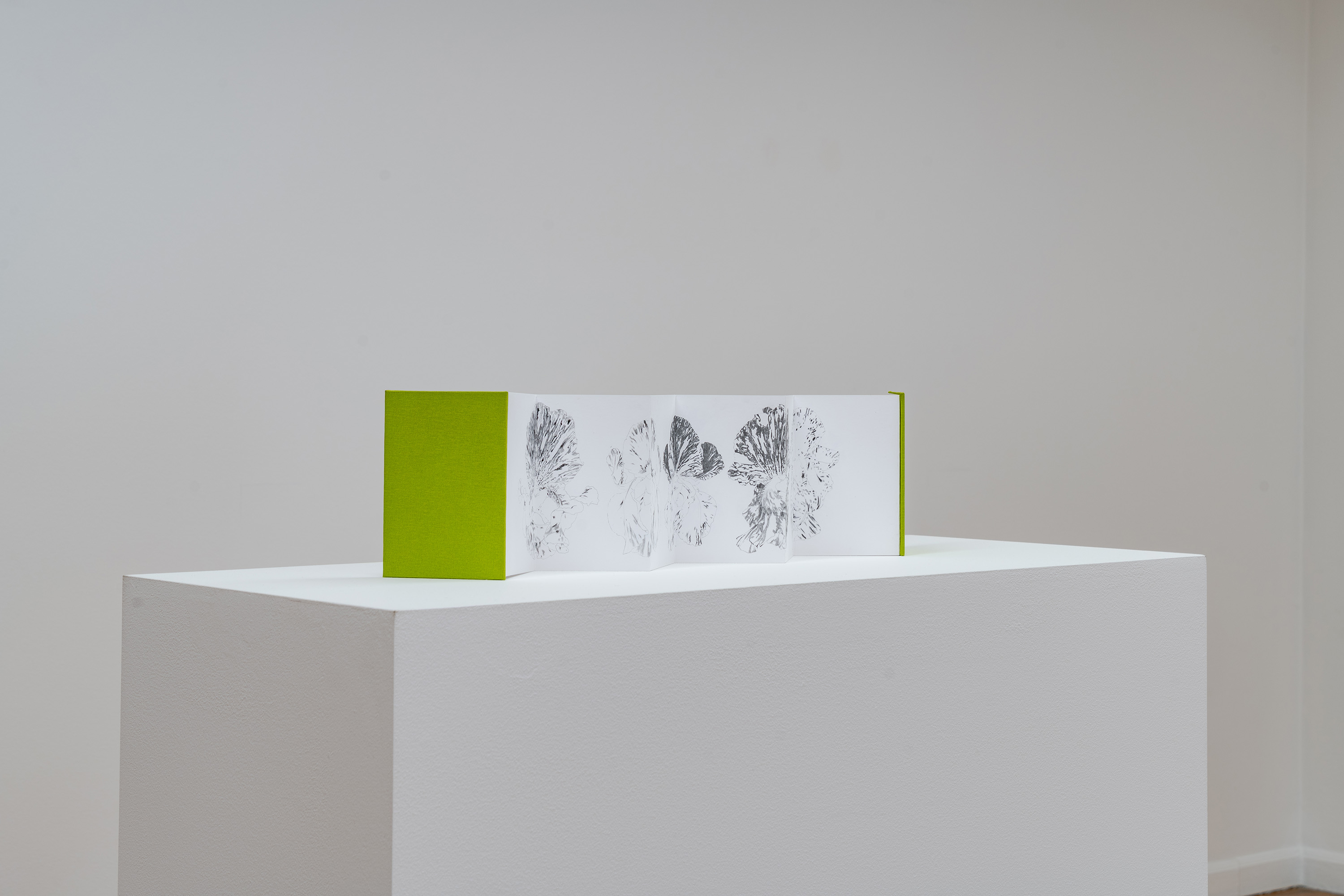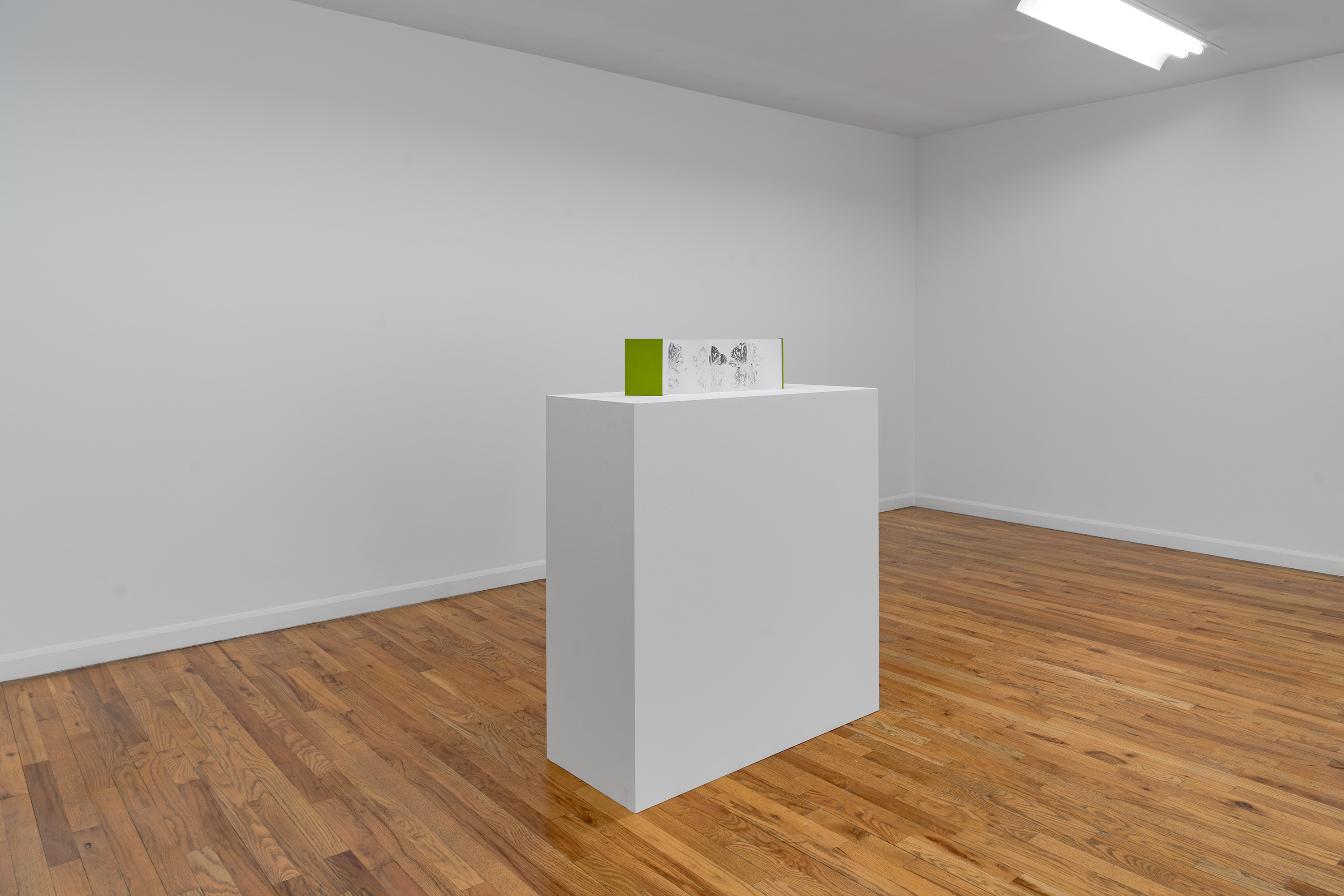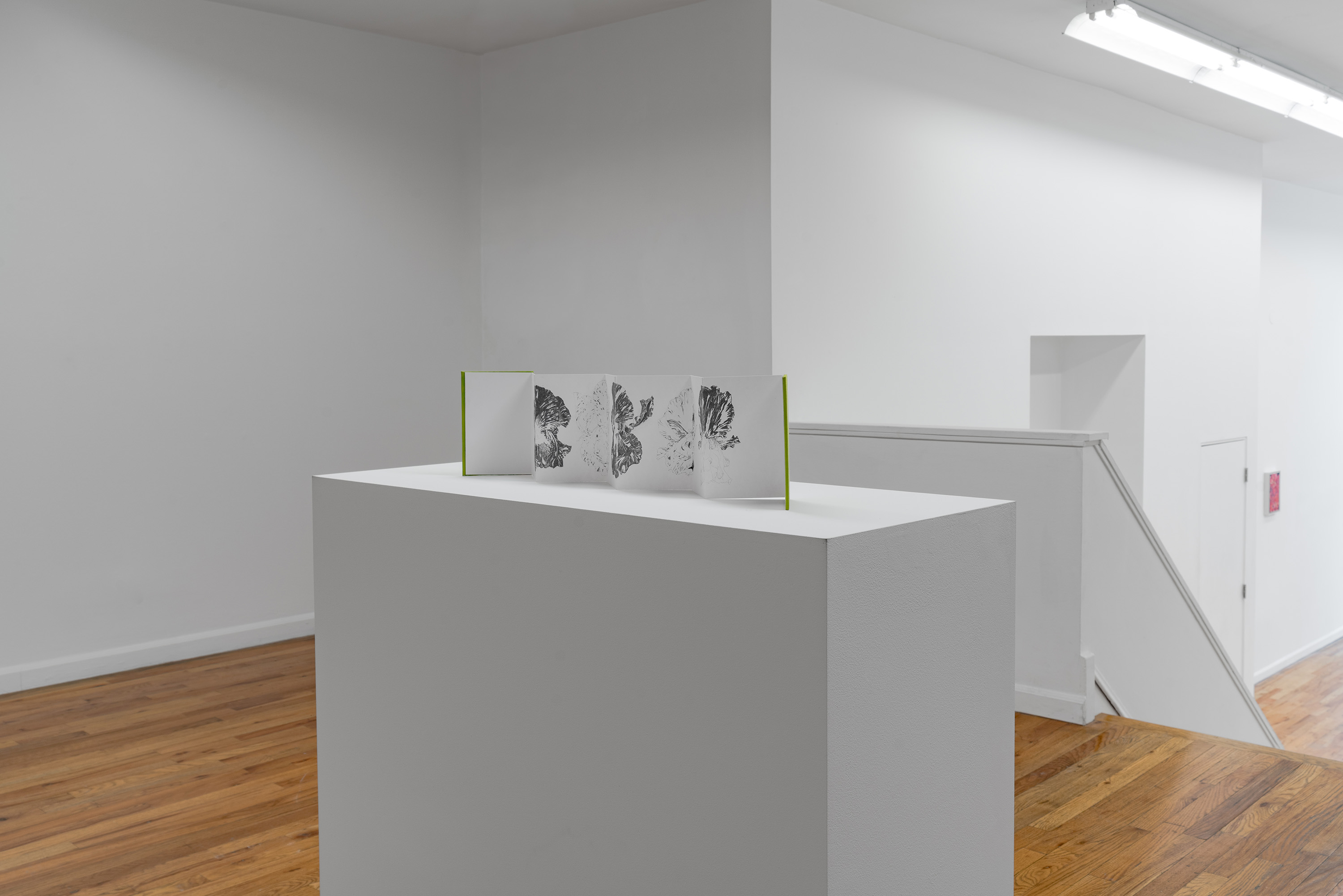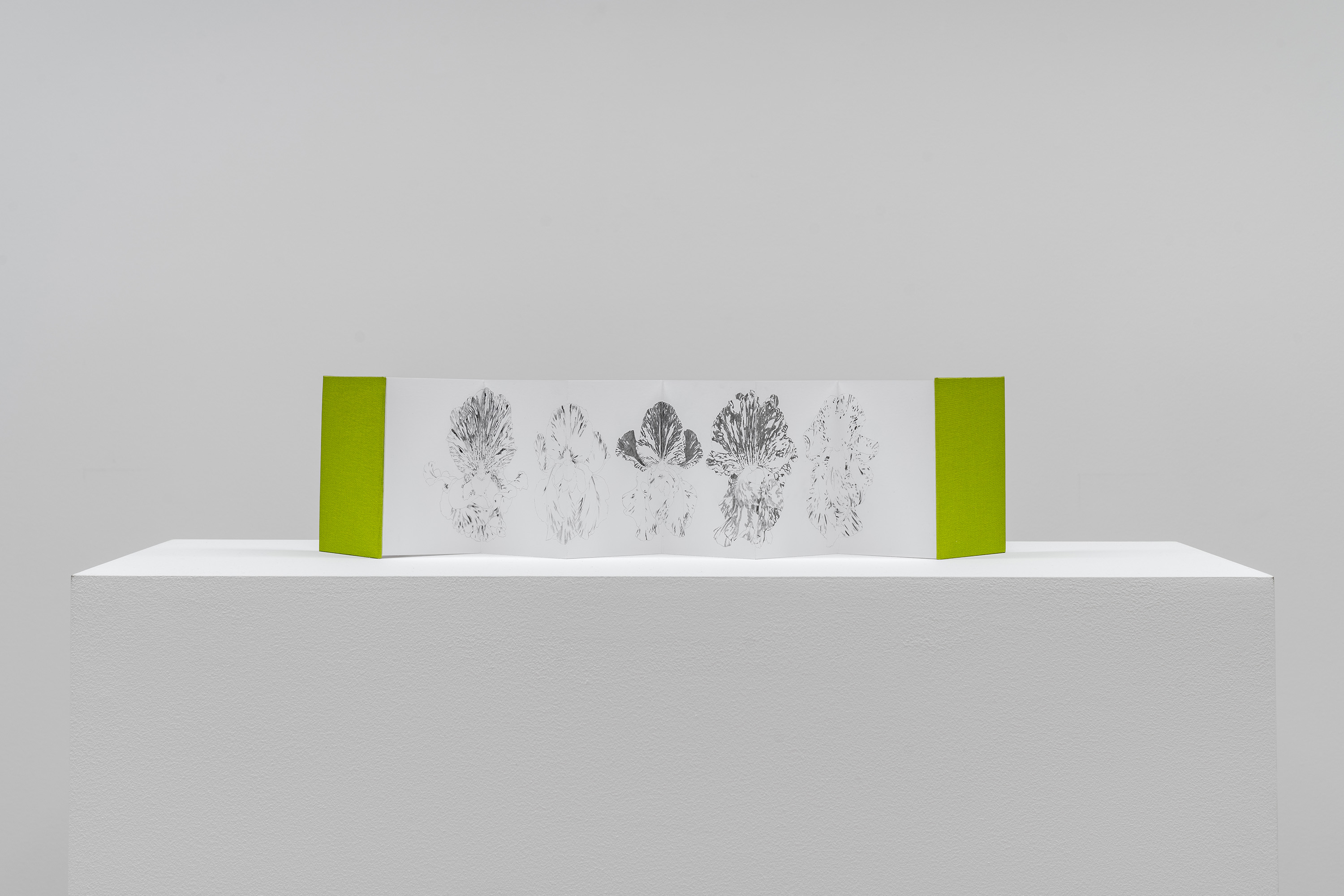 Folds, color, patterns, and texture are crucial parts of the selection criteria for King. Each painting is made one-at-a-time over the course of months, so selection itself is a laborious act of consideration. The fold in particular is the primary driver of tension. Whereas a pattern may serve to quiet formal tensions through repetition, the folds in these garments disrupt and reorient, shifting the tension into a more desirous territory where the predictable becomes mysterious. The impact of this effect is elevated when there are colors that invite your eyes to linger and textures that call your fingers to reach through and touch them. Through additional details of the source pages (each painting shows the pages curving into the book’s spine and reflecting the light from the studio in which it was made), King’s paintings provide access to what is both gained and withheld in her engagement with the pages, allowing the paintings to toggle us between offers and denials of the fabrics themselves. Her exploration of folds aligns directly with her use of flowers in King’s accompanying artist book. When fully opened, the accordion-style book presents a series of ten drawings examining the petal patterns of an iris arranged linearly across two sides of a single sheet of paper. Rather than centering each drawing between the accordion folds, King has centered them directly on the folds, a disruption that is more suggestive of conjoining than separating. The folds in the books, the folds in the fabric: these are sites of romantic tension, where what was apart comes together, and desire and the anticipation of gratification can be felt.
