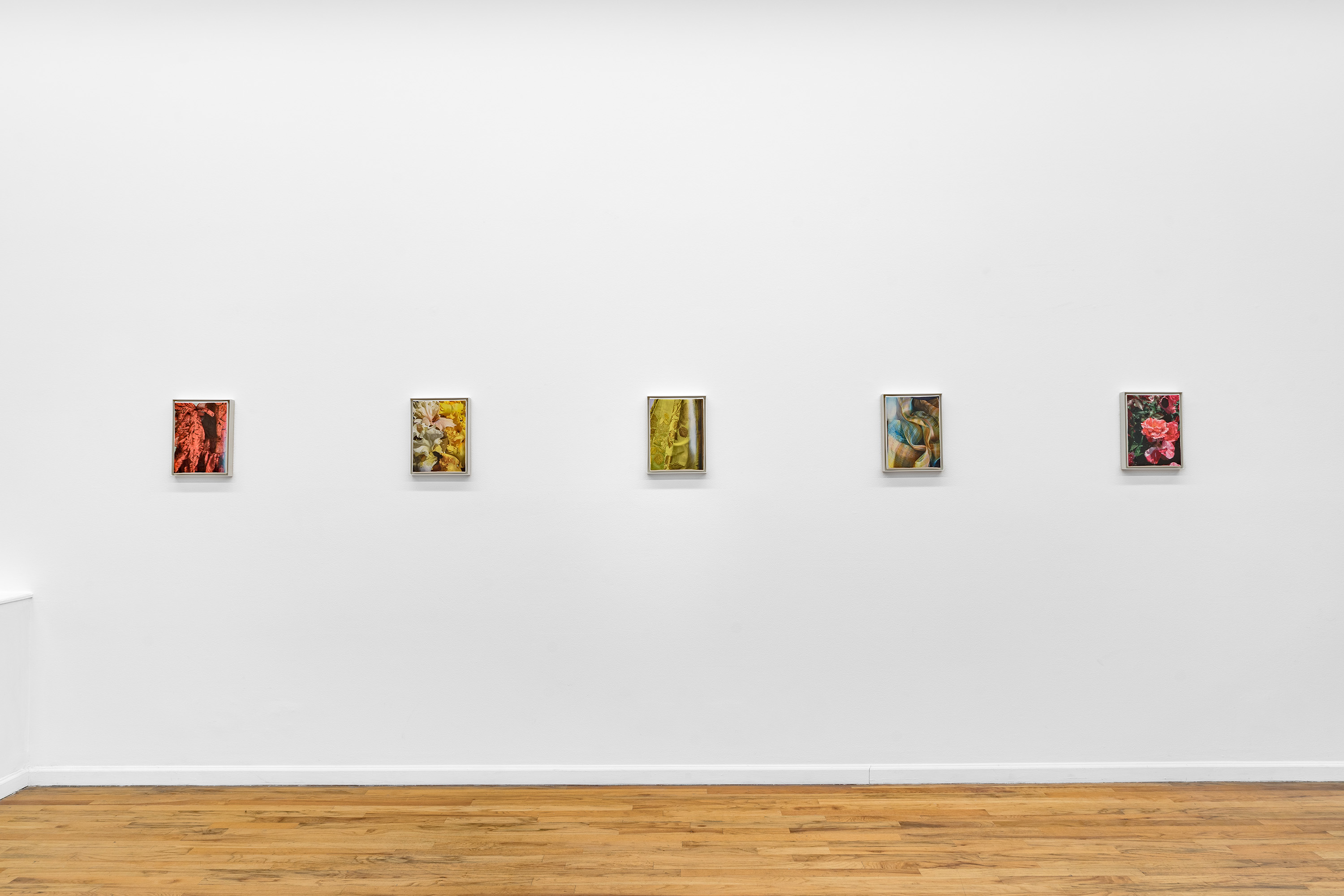 As with most of King’s work, the Fabric paintings are attempts to replicate an experience of sustained looking that she first captures through photography. This has always been the case with the Flower paintings. Flowers are sourced locally with an eye toward painting them, then arranged and rearranged in response to the natural lighting conditions of her studio in Los Angeles until she settles on the right representative composition that she then photographs before bringing it out through painting. The lone exception is the latest edition, Flower no.28. The flower in this painting was photographed in situ in the rose garden at the Huntington Library, Art Museum, and Botanical Gardens in San Marino, California. Being in the presence of the many roses in this garden is sensorially overwhelming, and her modified approach to this particular flower allowed her method to commingle with another’s, in this case the botanist or designer tasked with organizing these roses and inviting the public to share in their intimacy with the subject. The photograph’s used to make the Fabric paintings are not her photographs of the fabrics themselves, but rather of book pages on which she found the source images of historic garments. It is through these new layers of process, and the intersection of the qualities of the fabric with the qualities of the book page and those of the environment in which they were photographed that we begin feeling the pull toward desire, tension, and romance.